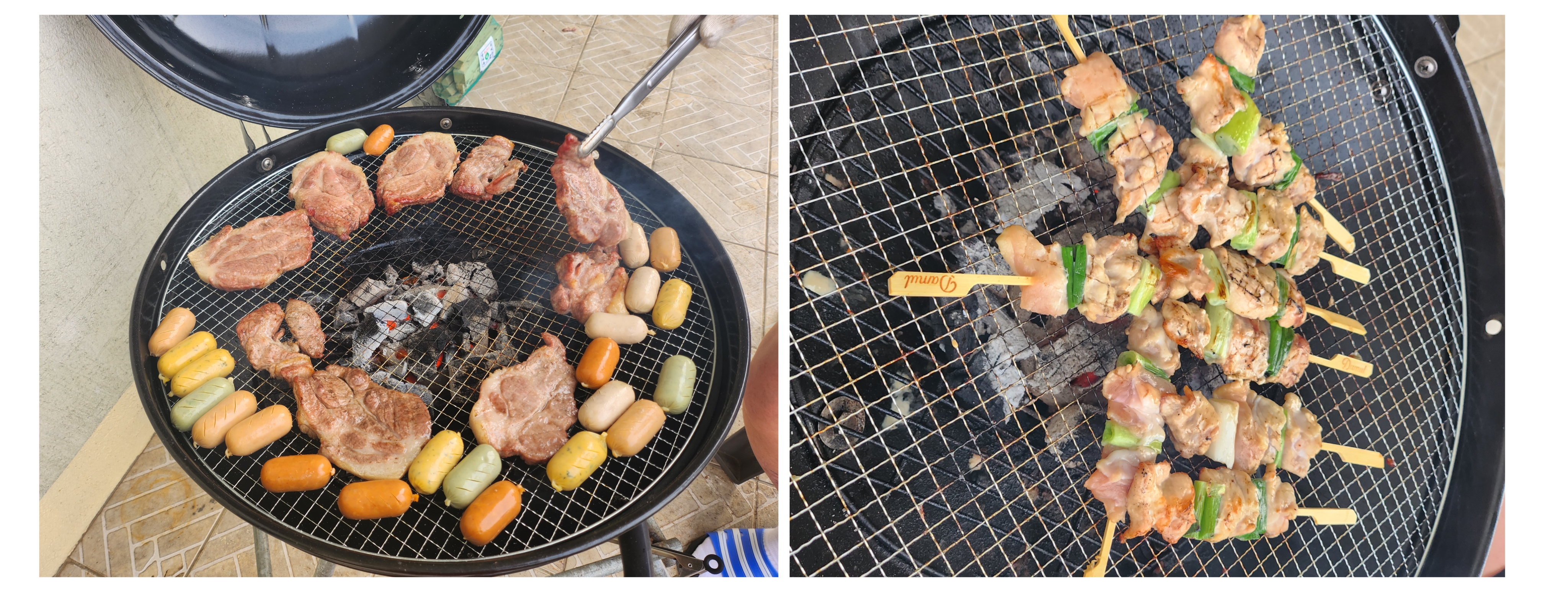 숯불에 구워지는 목살과 소시지 그리고 닭꼬치 보이시나요?