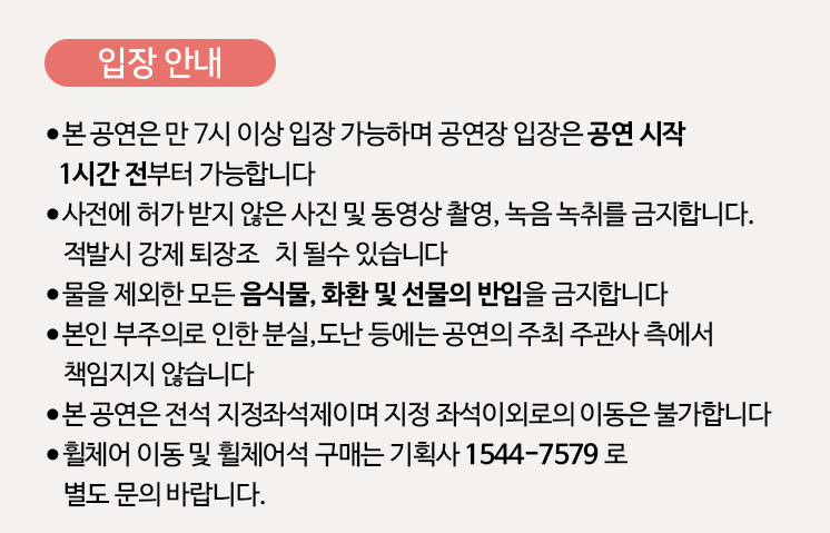이번 공연의 경우 지정좌석제로 진행될 예정이고 좌석등급은 3단계로 나뉘어 있고, 공연장의 경우 물을 제외한 모든 음식 반입을 금지하고 있다는 점 참고하시기 바랍니다.