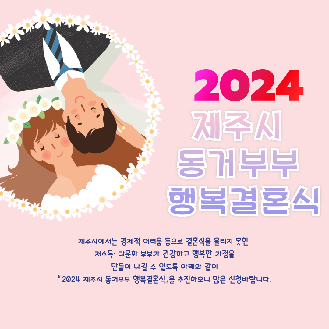 제주시에서는 경제적 어려움 등으로 결혼식을 올리지 못한 저소득· 다문화 부부가 건강하고 행복한 가정을 만들어 나갈 수 있도록 아래와 같이 『2024 제주시 동거부부 행복결혼식』을 추진하오니 많은 신청바랍니다.